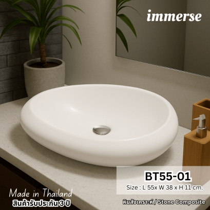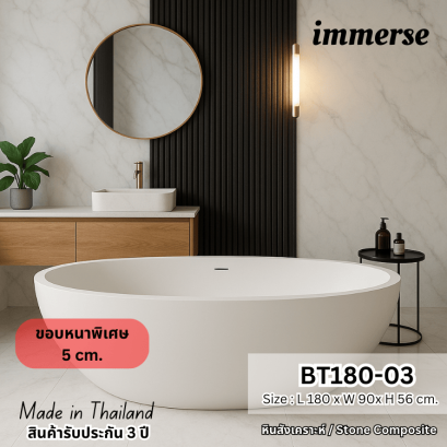 อ่างอาบน้ำหินสังเคราะห์ลอยตัว ทรงรี ดีไซน์โมเดิร์น [ รุ่นขอบหนา 5 cm. ] อ่างอาบน้ำหินสังเคราะห์ ลอยตัวทรงรี ขนาดมาตรฐาน 180×90×56 ซม. ผลิตจากวัสดุคุณภาพสูง แข็งแรงทนทานต่อการใช้งานยาวนาน พร้อมพื้นผิวเรียบหรู ดูแลรักษาง่าย เหมาะสำหรับห้องน้ำสไตล์โมเดิร์นและหรูหรา ด้วยคุณสมบัติที่ น้ำหนักเบากว่าอ่างหินจริง ทำให้ง่ายต่อการเคลื่อนย้ายและติดตั้ง อ่างอาบน้ำรุ่นนี้ถูกออกแบบตามหลักสรีระ รองรับการนอนแช่อย่างพอดี มอบประสบการณ์การผ่อนคลายเสมือนสปาภายในบ้าน ไม่เพียงตอบโจทย์การใช้งาน แต่ยังช่วย ยกระดับบรรยากาศห้องน้ำ ให้โดดเด่น มีระดับ และสะท้อนรสนิยมที่ทันสมัย Freestanding Solid Surface Oval Bathtub – Modern Design [5 cm Thick Rim Model] This freestanding oval solid surface bathtub, with standard dimensions of 180 × 90 × 56 cm, is crafted from high-quality materials for exceptional strength, durability, and long-lasting performance. Its sleek, refined surface is easy to clean and maintain, making it a perfect choice for both modern and luxury bathrooms. Lighter than natural stone tubs, it is easy to move and install, while the ergonomic design ensures perfect body support for a comfortable and deeply relaxing soak — creating a spa-like experience in the comfort of your home. More than just functional, this bathtub elevates the ambiance of any bathroom, adding distinction, sophistication, and a reflection of contemporary taste.
