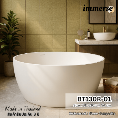 อ่างอาบน้ำหินสังเคราะห์ อ่างอาบน้ำกลม ทรงกลม ดีไซน์หรูหรา ขนาดเส้นผ่านศูนย์กลาง 130 cm. สูง 55 cm. ผลิตจากวัสดุคุณภาพ แข็งแรงทนทานต่อการใช้งานยาวนาน พื้นผิวเรียบเนียน สวยงาม และดูแลรักษาง่าย อ่างอาบน้ำหินสังเคราะห์ทรงกลมรุ่นนี้ออกแบบให้รองรับการนอนแช่น้ำอย่างสบาย ช่วยสร้างบรรยากาศผ่อนคลายเสมือนอยู่ในสปาส่วนตัวภายในบ้าน เหมาะสำหรับห้องน้ำสไตล์โมเดิร์น รีสอร์ท หรือบ้านพักหรู ที่ต้องการเพิ่มความโดดเด่นและความพิเศษในการตกแต่ง ติดตั้งสะดวกและตอบโจทย์ทั้งความงามและฟังก์ชันการใช้งานอย่างลงตัว Solid Surface Round Bathtub – Luxurious Design This round solid surface bathtub, with a diameter of 130 cm and a height of 55 cm, is crafted from high-quality materials for superior strength, durability, and long-lasting performance. The smooth, elegant surface is not only visually stunning but also easy to clean and maintain. Designed to provide optimal comfort for soaking, this round model transforms your bathroom into a private spa-like retreat, offering a deeply relaxing experience. Perfect for modern bathrooms, luxury resorts, or upscale residences, it adds distinction and sophistication to any interior. Lightweight and easy to install, this bathtub seamlessly combines aesthetic appeal with practical functionality.