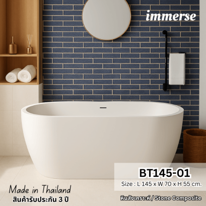 อ่างอาบน้ำหินสังเคราะห์ ทรงรีทันสมัย ผลิตจากวัสดุคุณภาพสูง แข็งแรงและทนทานต่อการใช้งานยาวนาน ขนาดมาตรฐาน 145×70×55 cm. ออกแบบในสัดส่วนที่พอดี รองรับการนอนแช่น้ำเพื่อการผ่อนคลายได้อย่างสบาย พื้นผิวเรียบเนียน ดูหรูหรา และดูแลรักษาง่าย ติดตั้งสะดวก น้ำหนักเบากว่าอ่างหินจริง เหมาะสำหรับการตกแต่งห้องน้ำทั้งสไตล์โมเดิร์น หรูหรา หรือมินิมอล อ่างอาบน้ำหินสังเคราะห์รุ่นนี้ช่วยยกระดับบรรยากาศห้องน้ำให้เสมือนสปาส่วนตัวในบ้าน เติมเต็มความสุขของการพักผ่อน และตอบโจทย์ทั้งความสวยงามและการใช้งานจริงอย่างลงตัว Solid Surface Oval Bathtub – Contemporary Elegance This contemporary oval solid surface bathtub is crafted from premium-quality materials, offering exceptional strength and long-lasting durability. With its standard dimensions of 145 × 70 × 55 cm, the design is perfectly proportioned to provide superior comfort and support for relaxing soaks. The smooth, refined surface exudes luxury and elegance, while remaining easy to clean and maintain. Lighter than natural stone tubs, it is also easy to transport and install, making it a practical yet stylish choice. Versatile in style, this bathtub complements modern, luxurious, or minimal bathrooms, transforming the atmosphere into a private spa-like retreat at home. It enhances both the beauty and functionality of the space, delivering the perfect balance of relaxation, sophistication, and everyday usability.