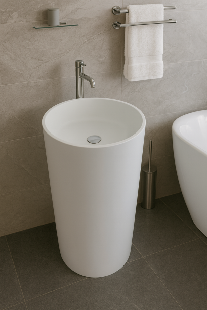 อ่างล้างหน้าทรงสูงแบบตั้งพื้น ผลิตจากหินสังเคราะห์ Solid Surface คุณภาพพรีเมียม แข็งแรง คงทนต่อการใช้งานยาวนาน ขนาดเส้นผ่านศูนย์กลาง 45 ซม. และความสูง 84 ซม. ถูกออกแบบอย่างพิถีพิถันให้มีสไตล์ทันสมัย เรียบง่ายแต่แฝงความหรูหรา เหมาะสำหรับห้องน้ำในทุกดีไซน์ ไม่ว่าจะเป็นบ้านพักอาศัย คอนโด หรือรีสอร์ท ผิววัสดุเนียนละเอียด ดูแลรักษาง่าย ไม่อมคราบสกปรกเหมือนหินธรรมชาติ จึงสะดวกต่อการทำความสะอาด ใช้งานได้ทั้งเป็นอ่างล้างมือและอ่างล้างหน้าในหนึ่งเดียว ด้วยขนาดกะทัดรัดช่วยประหยัดพื้นที่และจัดสรรได้อย่างลงตัว อ่างล้างหน้าหินสังเคราะห์รุ่นนี้จึงเป็นตัวเลือกที่ช่วยยกระดับความหรูหราและเพิ่มมูลค่าให้กับทุกโครงการ