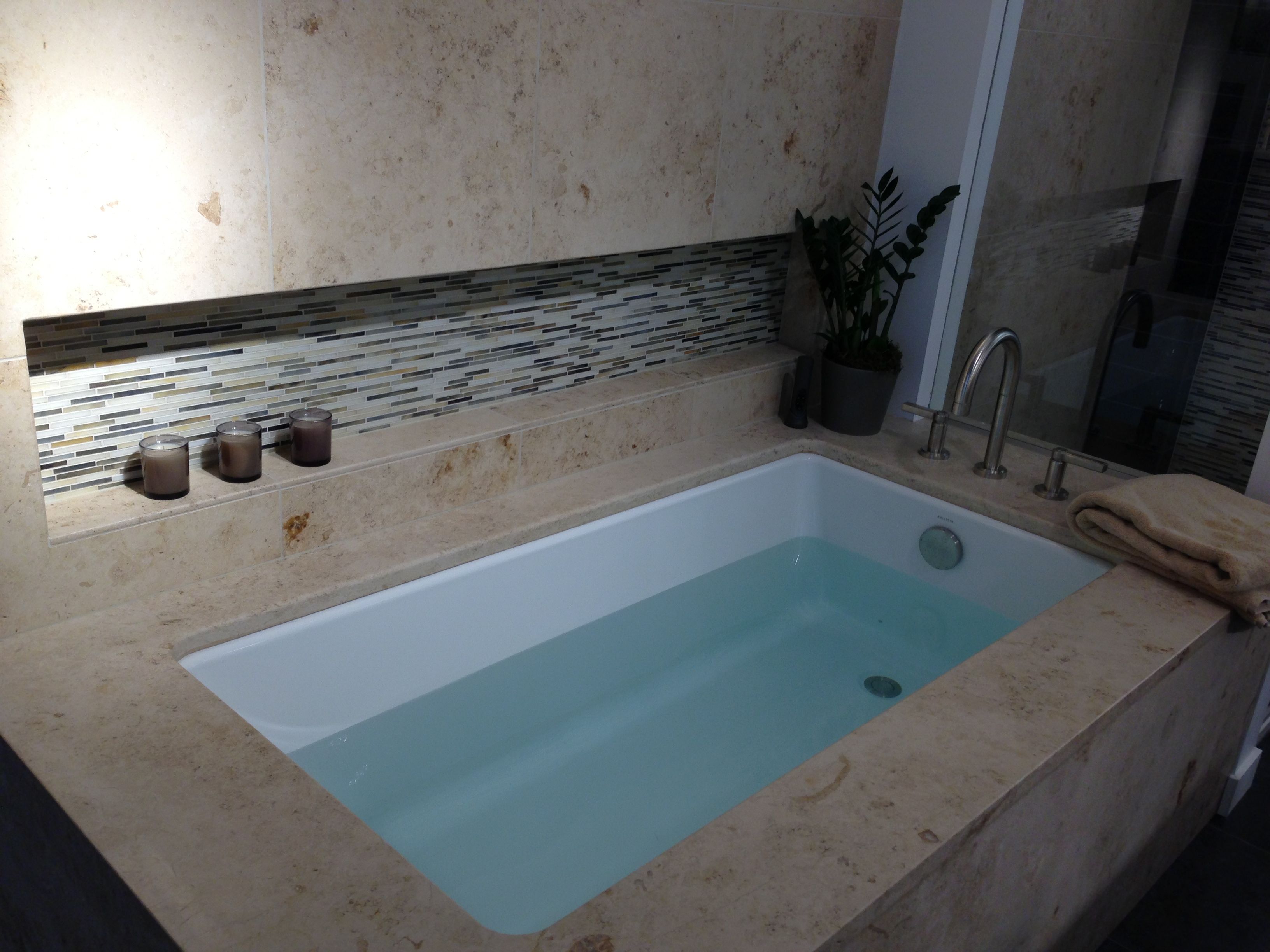 การติดตั้งในลักษณะนี้ให้ภาพรวมที่ดูเรียบร้อย อ่างเสมือนเป็นส่วนหนึ่งของห้องน้ำ เหมาะสำหรับการออกแบบที่เน้นความหรูหราและถาวร เช่น บ้านสไตล์คลาสสิกหรือห้องน้ำในโรงแรมบางแห่ง